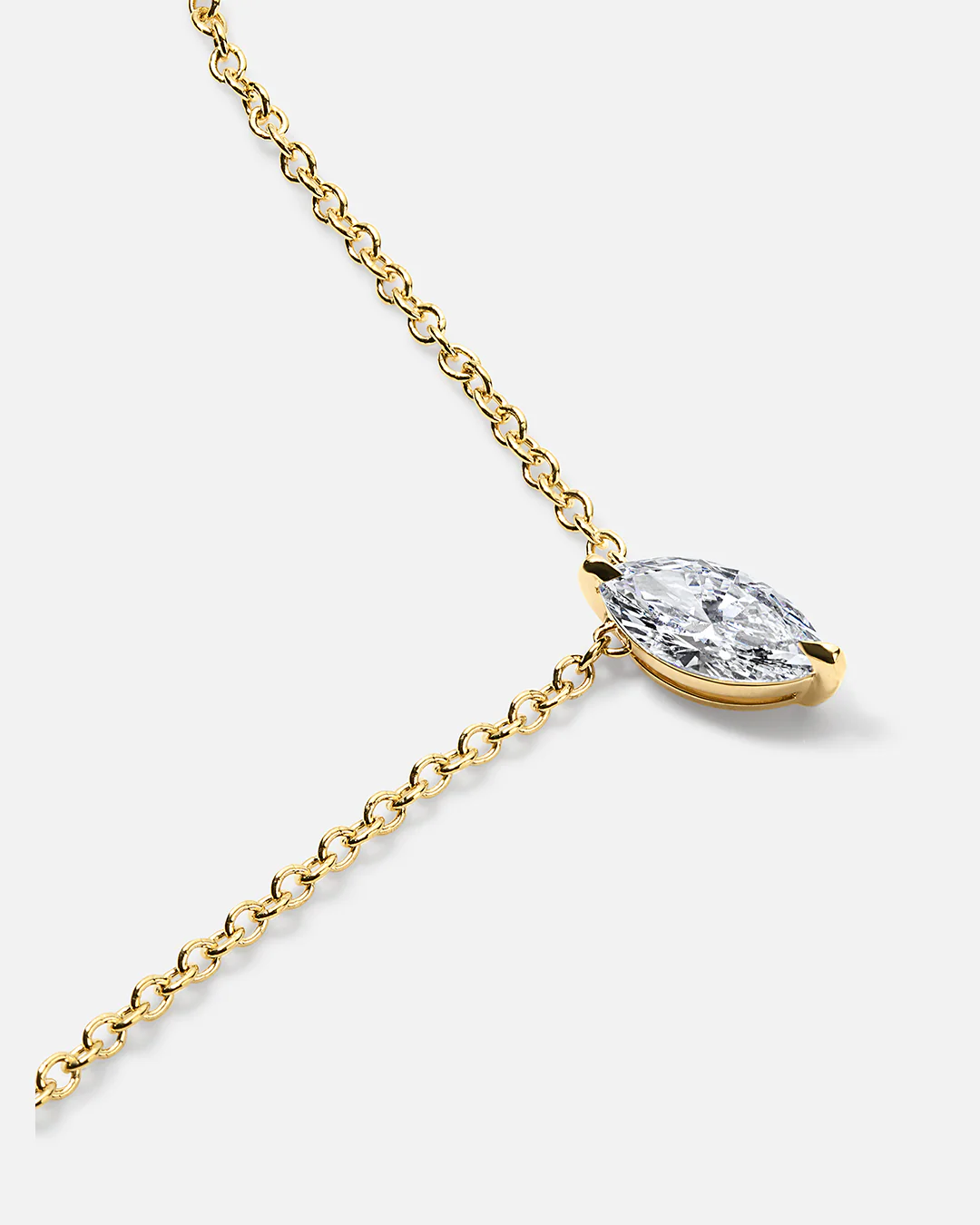 A striking, colorless marquise diamond floats gracefully against your décolletage.